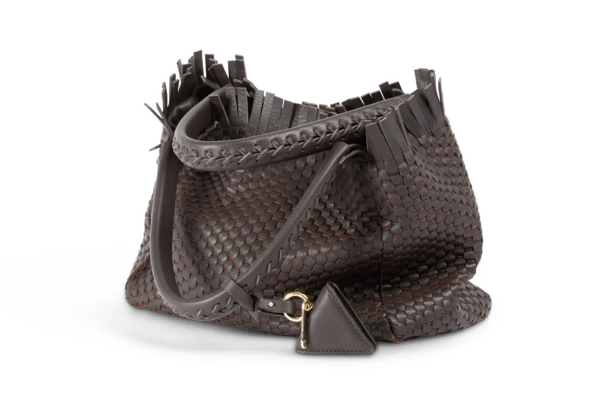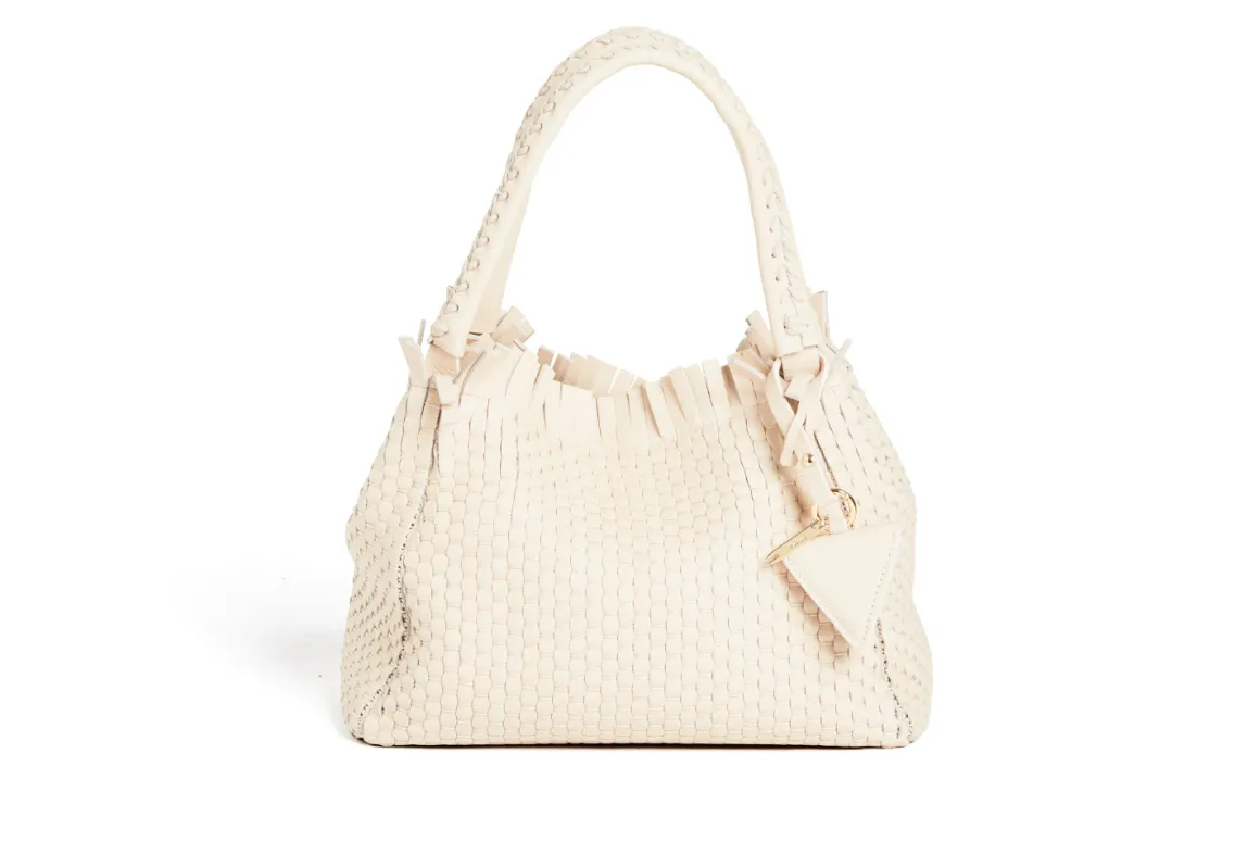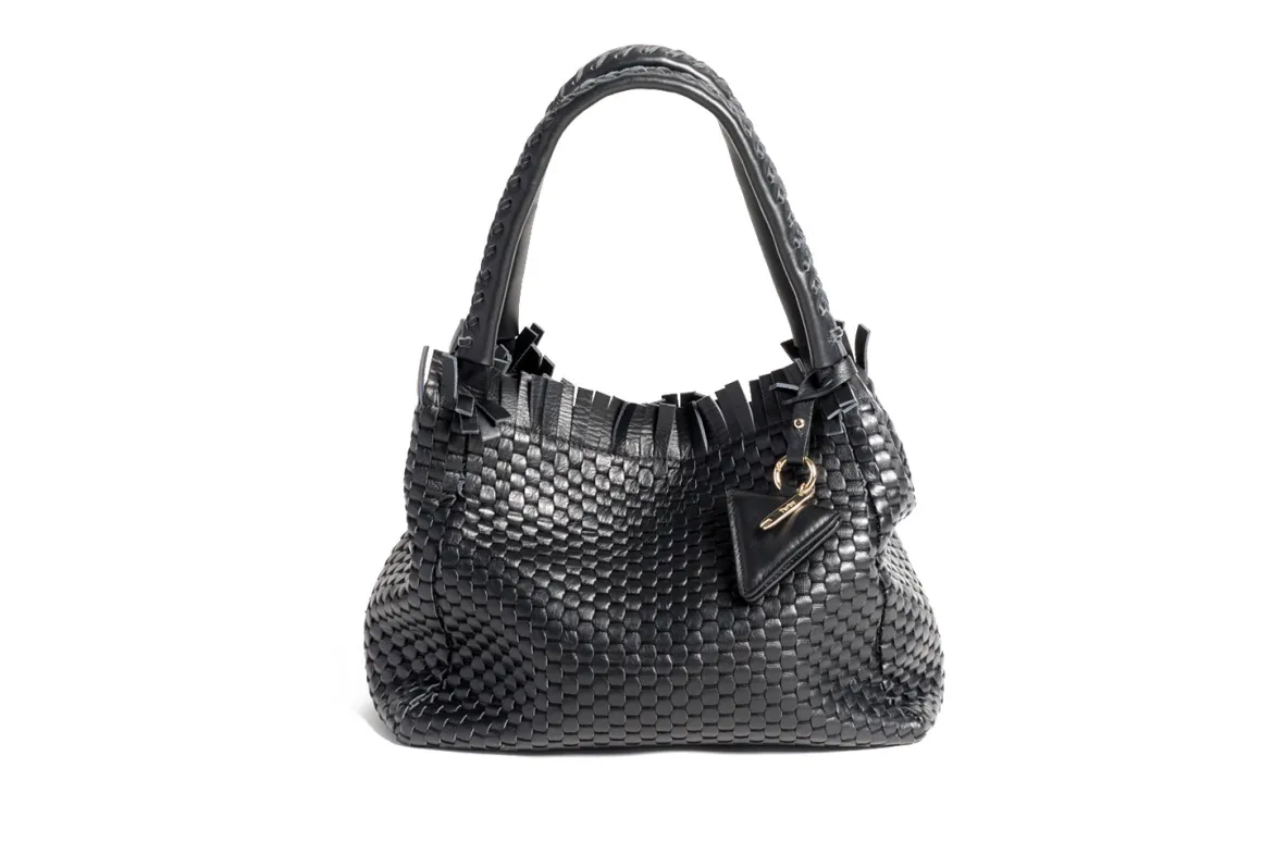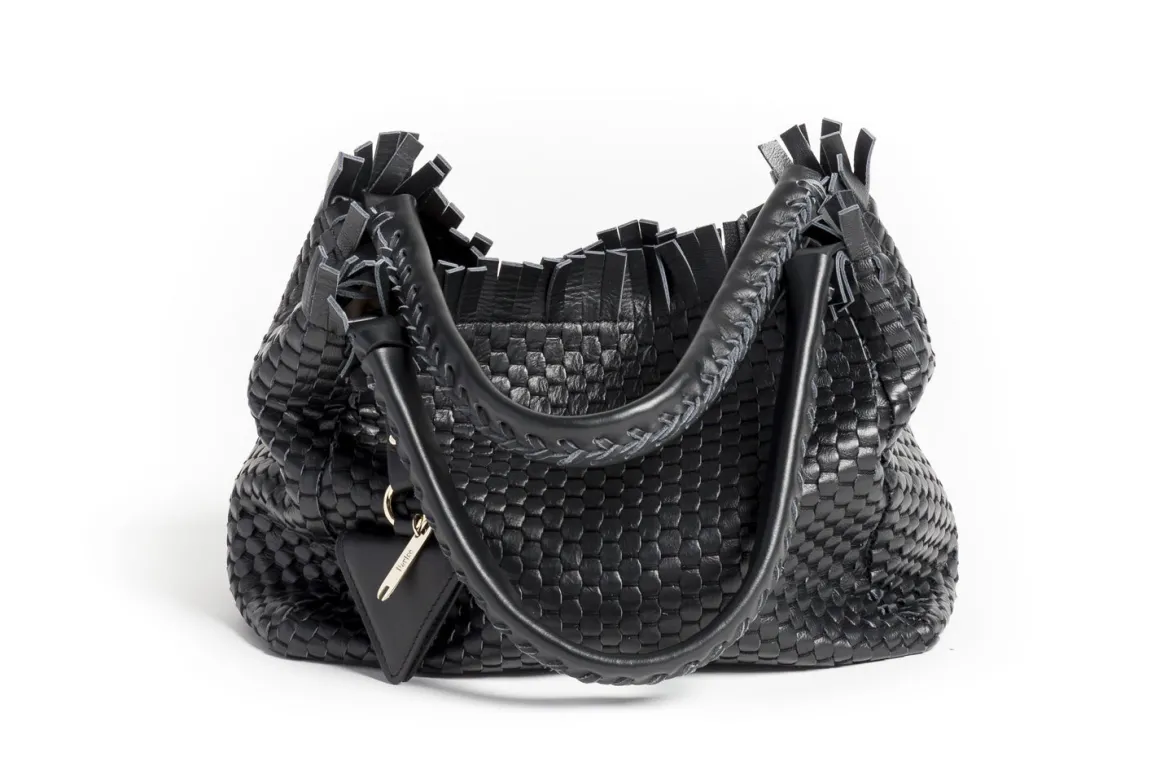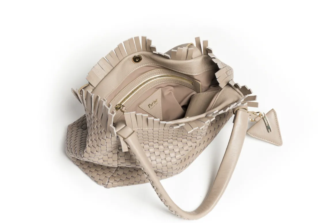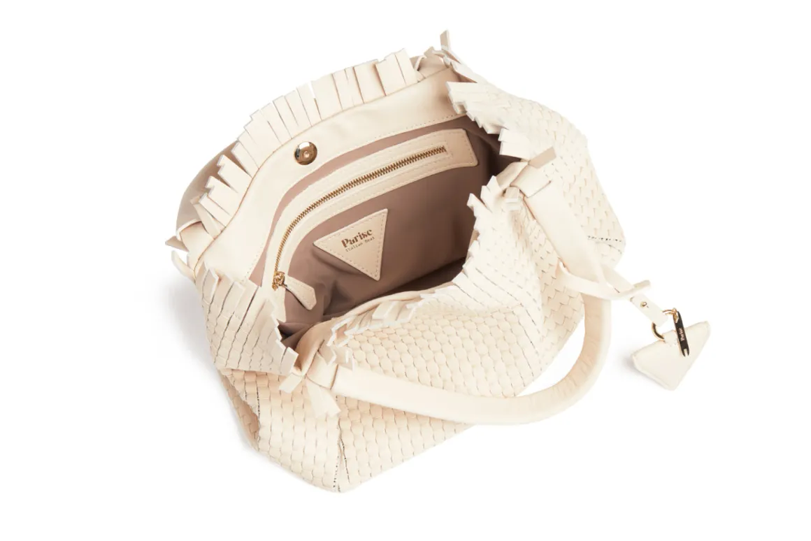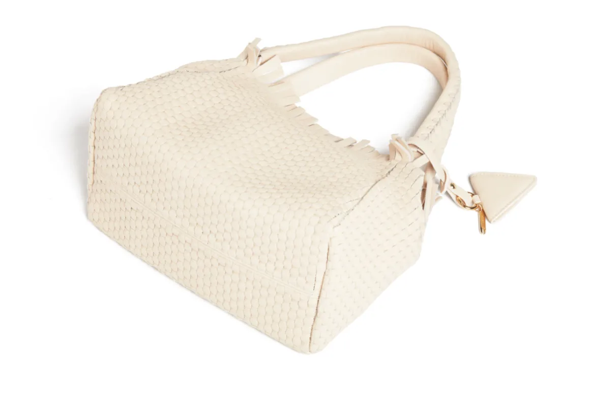 Prepare to be dazzled by the top fringes and double leather crossed top handles. This bag is not just a pretty face; it boasts an internal magnet button closure, one internal zip compartment, and two internal leather compartments. The white gold-colored metal hardware adds a touch of elegance, while the lining is made of 78% regenerated PA ECONYL® and 22% EA. Don’t miss the white gold shuttle charm and leather triangle, all proudly Made in Italy.