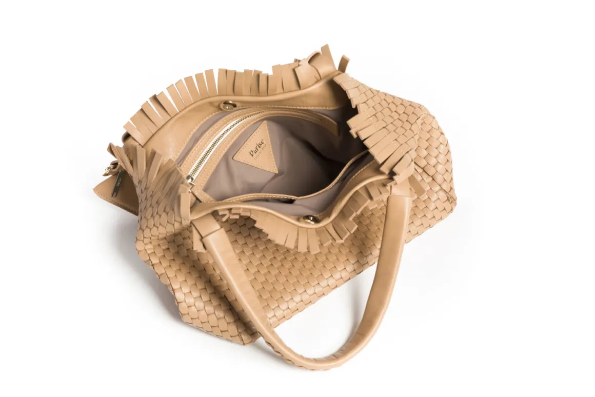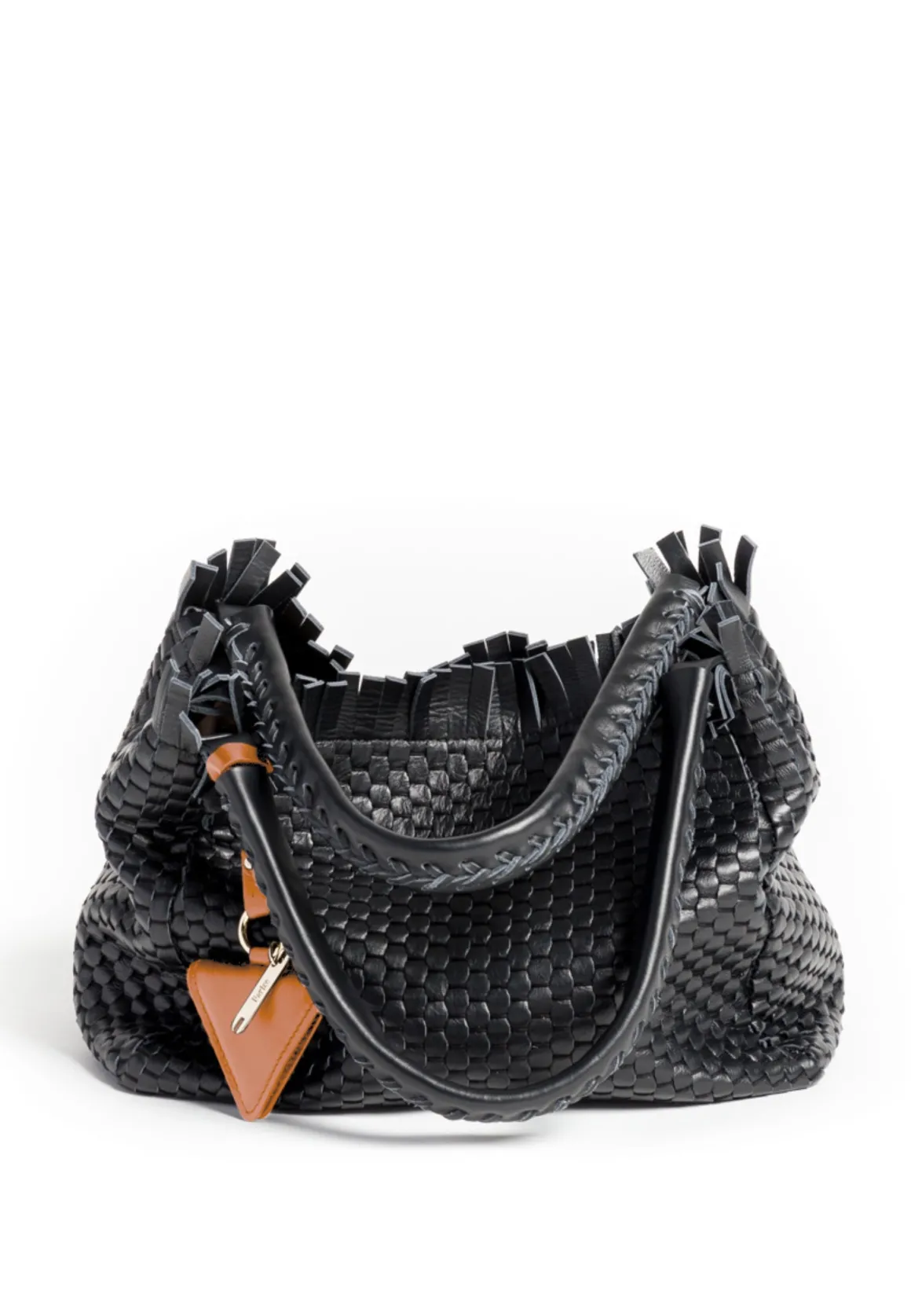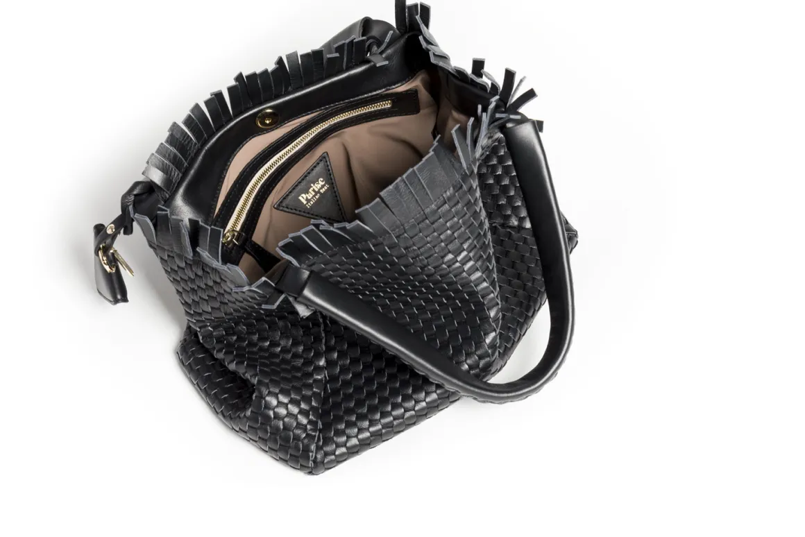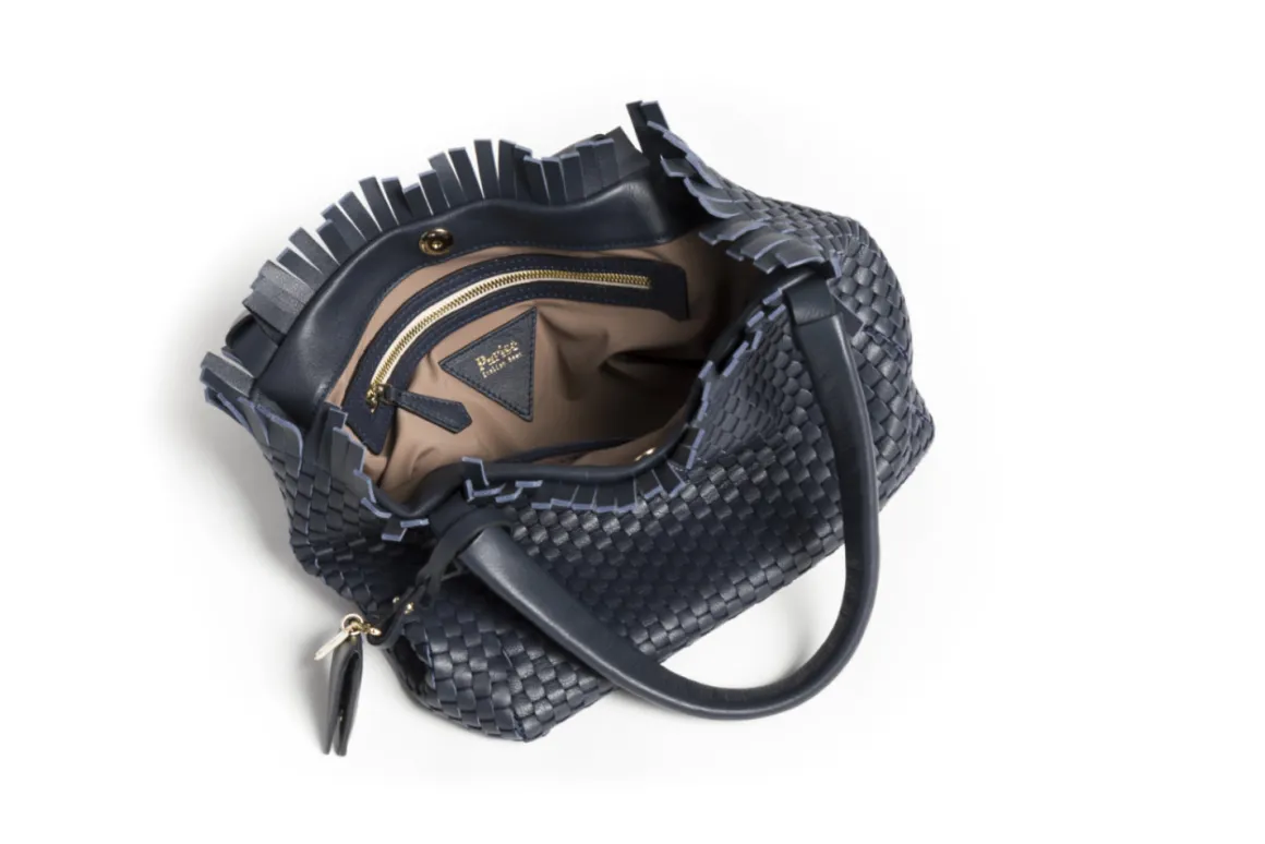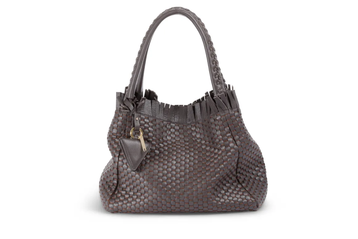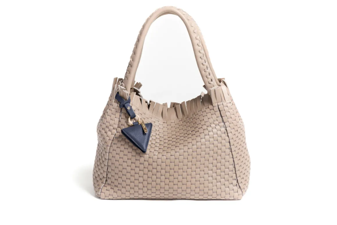 Prepare to be dazzled by the top fringes and double leather crossed top handles. This bag is not just a pretty face; it boasts an internal magnet button closure, one internal zip compartment, and two internal leather compartments. The white gold-colored metal hardware adds a touch of elegance, while the lining is made of 78% regenerated PA ECONYL® and 22% EA. Don’t miss the white gold shuttle charm and leather triangle, all proudly Made in Italy.