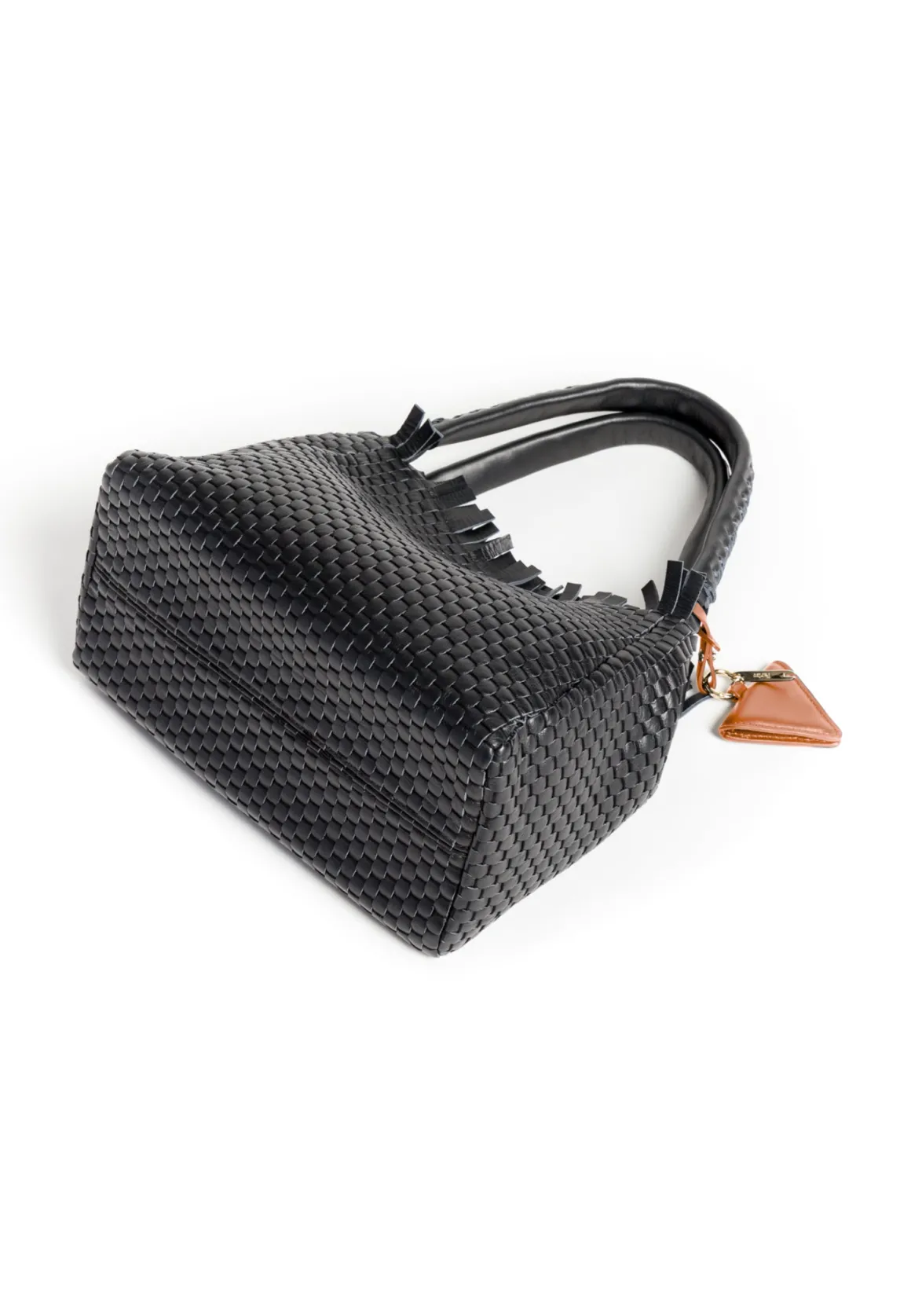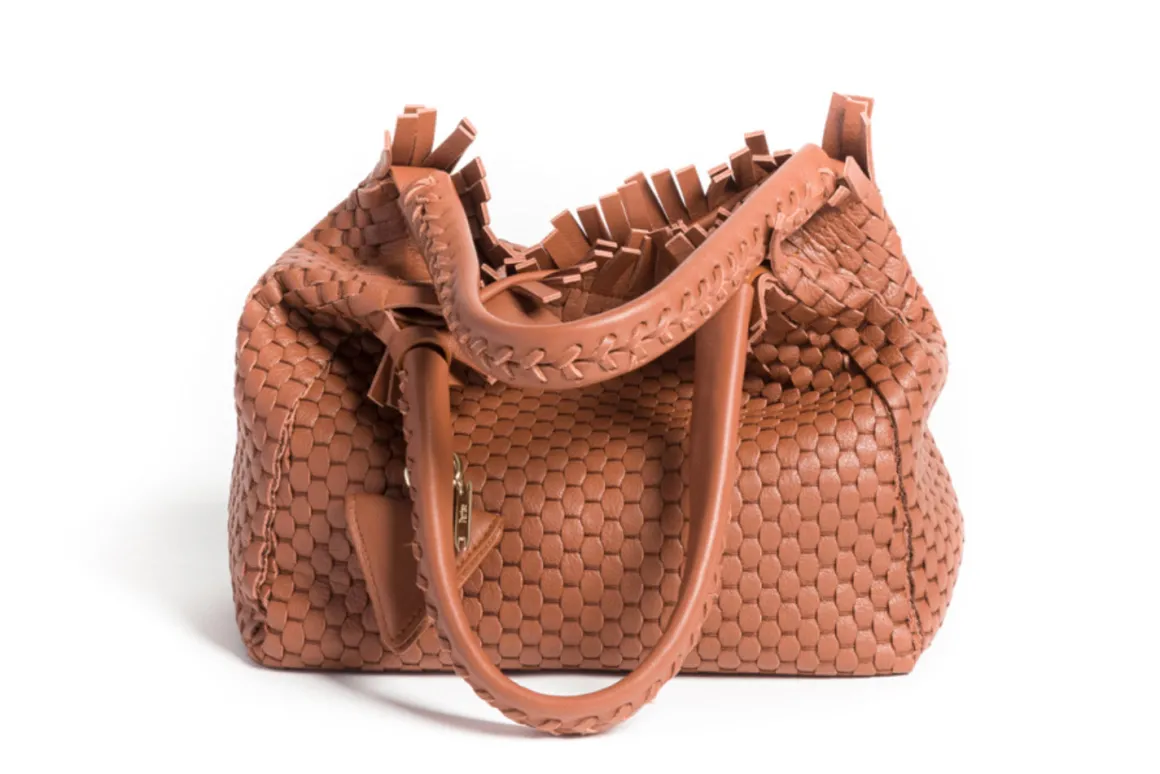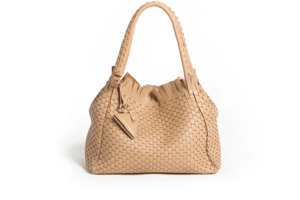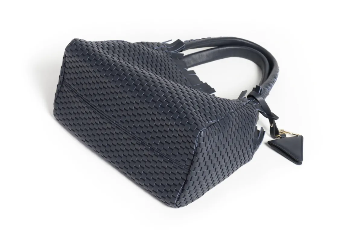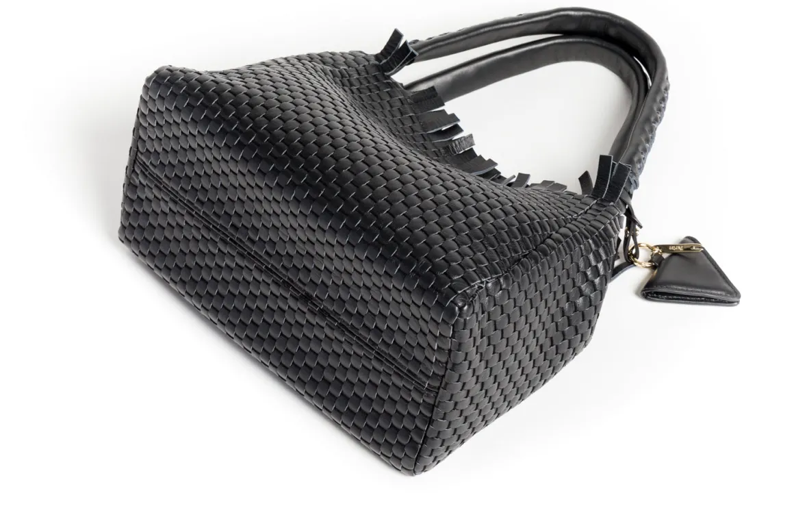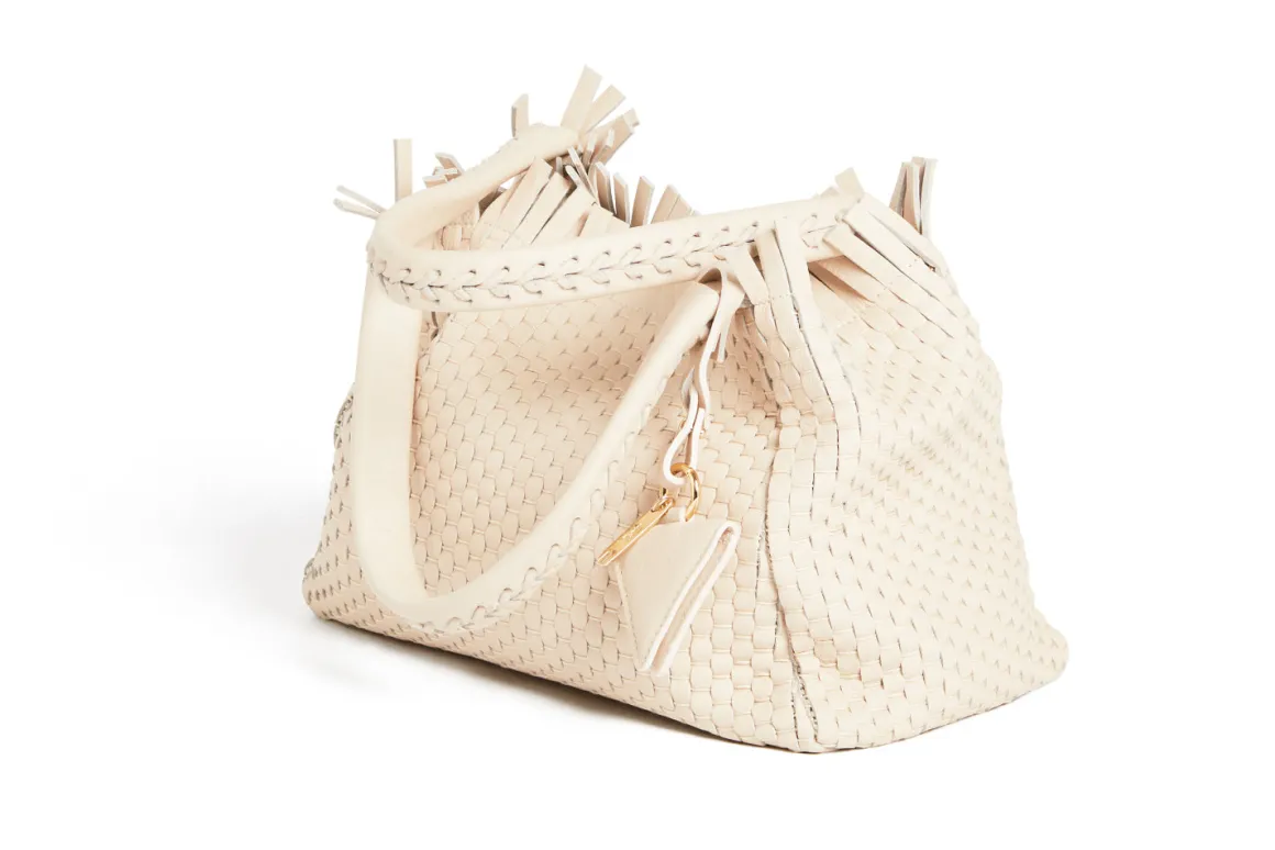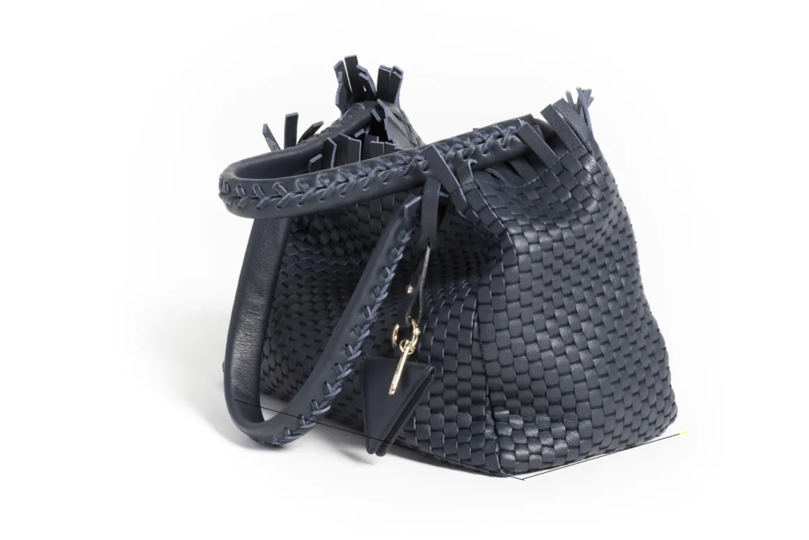 Prepare to be dazzled by the top fringes and double leather crossed top handles. This bag is not just a pretty face; it boasts an internal magnet button closure, one internal zip compartment, and two internal leather compartments. The white gold-colored metal hardware adds a touch of elegance, while the lining is made of 78% regenerated PA ECONYL® and 22% EA. Don’t miss the white gold shuttle charm and leather triangle, all proudly Made in Italy.