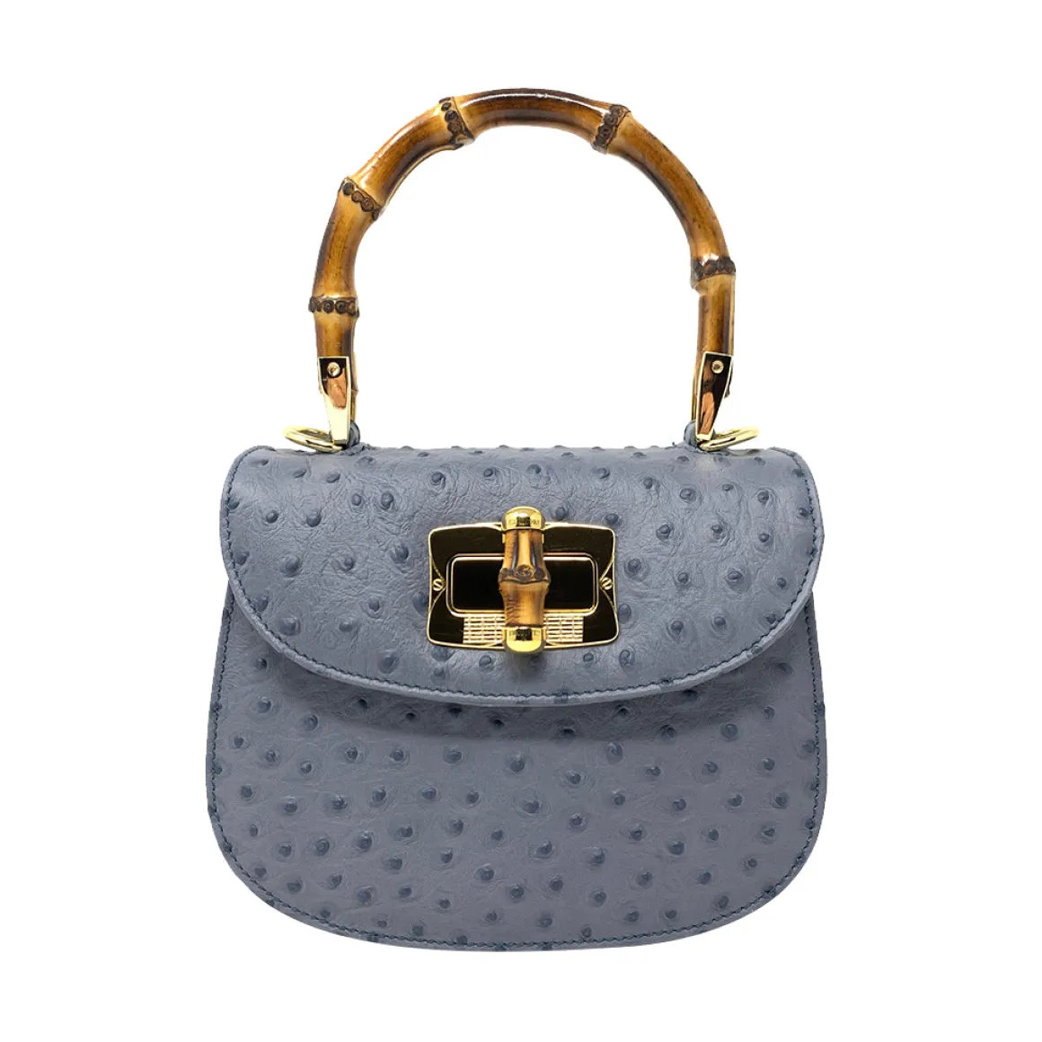 Introducing the Joly Small Bamboo, a luxurious top handle bag made for the modern woman on the go. Crafted with care by the renowned Italian artisans at Clamori, this bag is made from ostrich-embossed calfskin leather of the highest quality. The bamboo handle adds a touch of sophistication and a unique look to this already stunning bag. For added versatility, the Joly Small Bamboo comes with an adjustable strap that can be worn as a crossbody bag. With a height of 20 cm, width of 15 cm, and depth of 8 cm, this small but mighty bag is the perfect size to carry all your essentials. The grey color adds a touch of sophistication and suits any outfit, making it the perfect addition to your bag collection. us certified and 100% made in Italy, the Joly Small Bamboo is a testament to the unparalleled craftsmanship of Clamori. For the woman who demands both style and function, this bag is a must-have.
